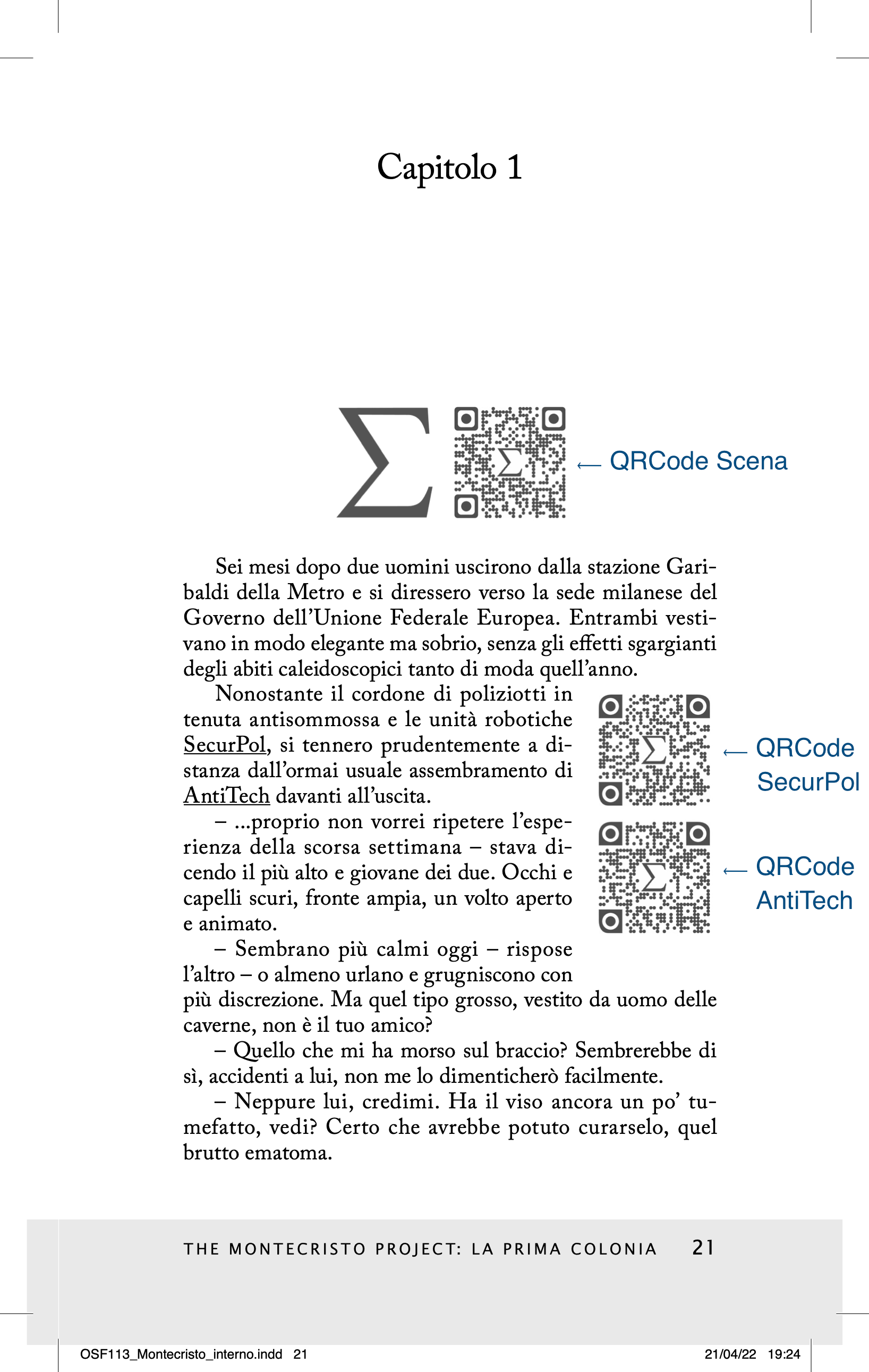Accanto al Glifo, un QRCode personalizzato che, se inquadrato con lo smartphone, porta sulla pagina Web della scena, nel caso che il lettore e-book non abbia funzioni di navigazione su Internet. In caso contrario, il QRCode contiene anche un link alla pagina stessa. Lo stesso link è contenuto nel Titolo.