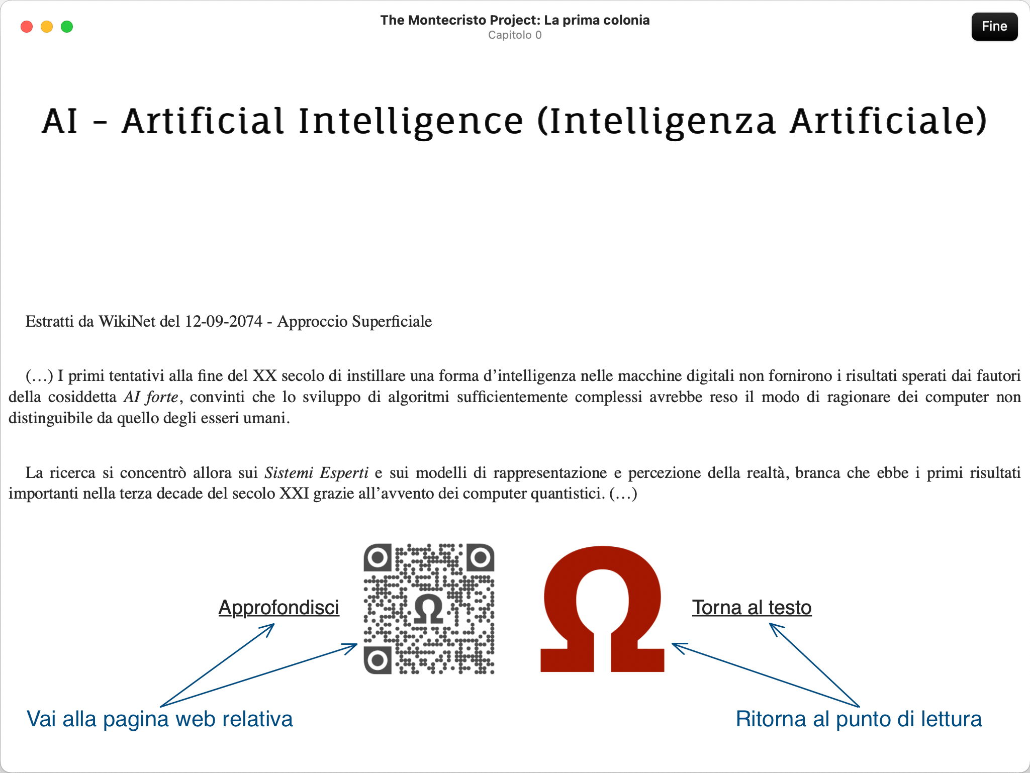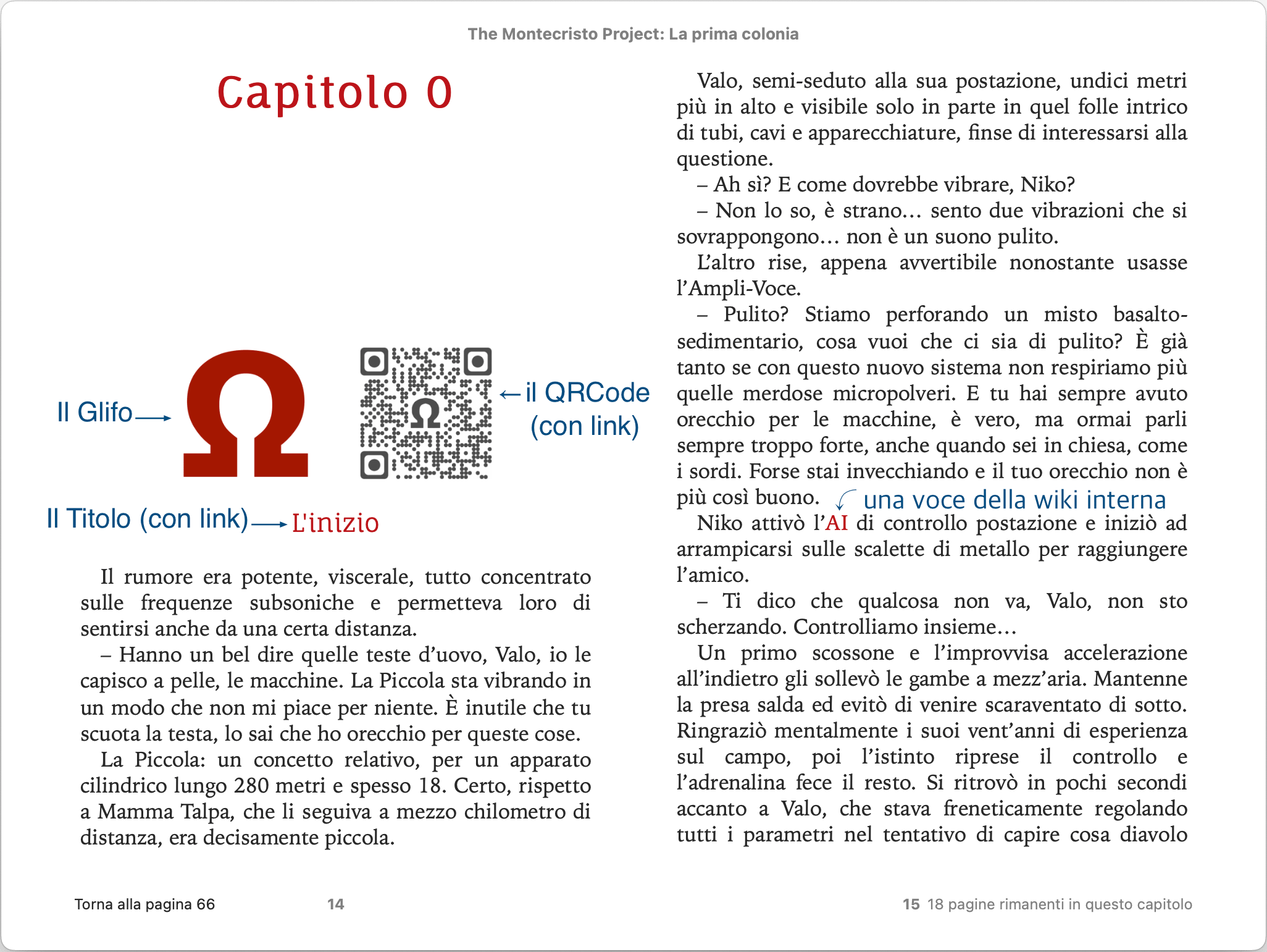 Qui sopra vedete la prima voce della wiki interna (molto corta, sì, ma ogni voce cresce insieme alla trama…). In basso, le due possibilità: approfondisci e il QRCode portano alla pagina Web del riferimento, dove aggiungerò gradualmente un terzo livello di approfondimento. Il Glifo e la voce “Torna al testo” riportano al punto di lettura da dove siamo partiti.