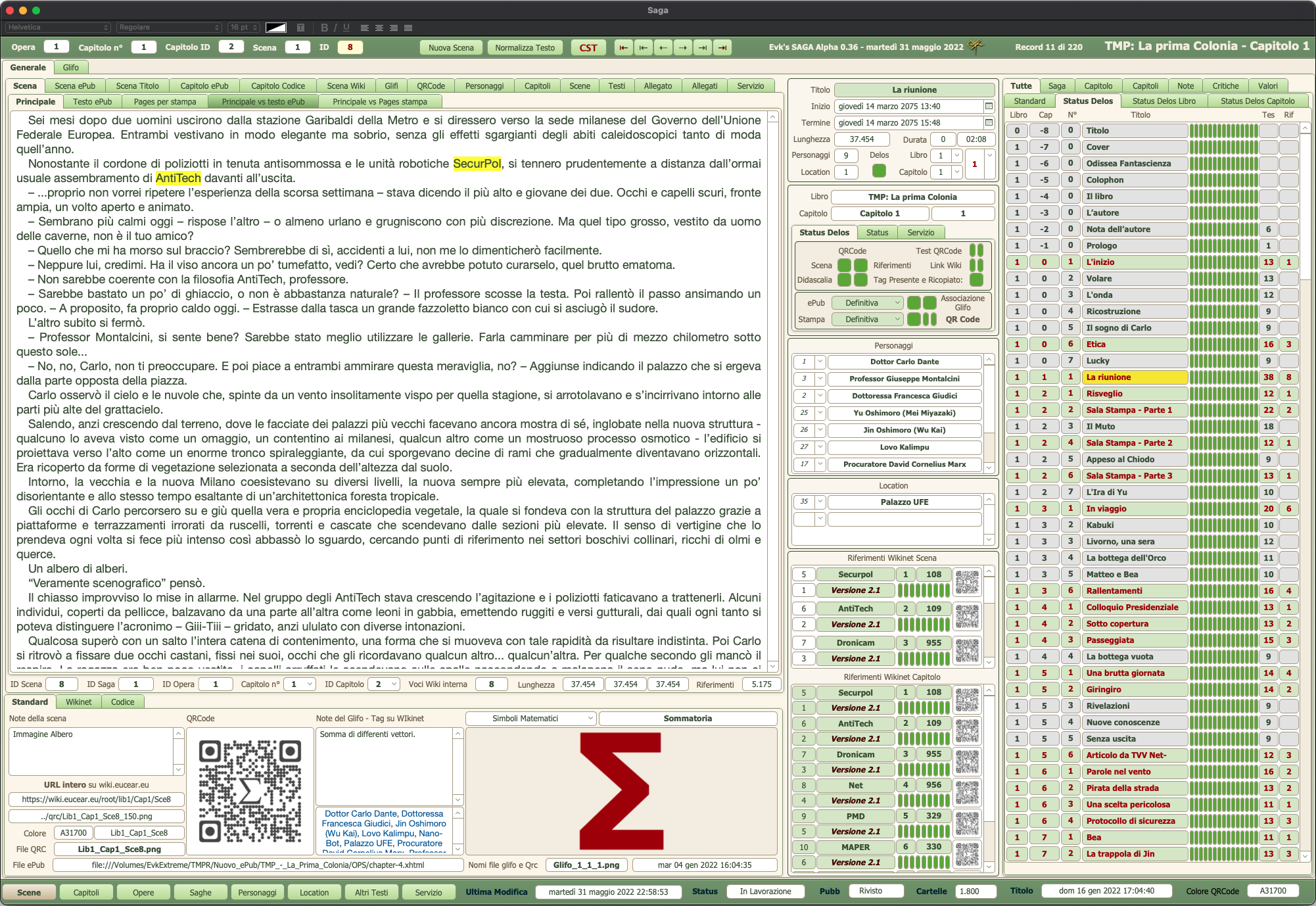 E così, gradualmente, aggiungendo e perfezionando funzioni in corso d’opera, ho sviluppato Saga così com’è adesso. Totalmente incentrato sulle mie esigenze specifiche, beninteso; organizza le scene in una struttura gerarchica per capitoli, i capitoli per opera, le opere per saghe (appunto). Per ogni scena mi permette di gestire personaggi e location (come altri software) ma anche ulteriori testi, organizzati per tipologia, come voci della wiki interna, versioni precedenti della scena, note e appunti. Ma anche codice, come quello relativo alla versione digitale in ePub, e allegati come illustrazioni, glifi, QRCode, audio e video, PDF dell’impaginato. E visualizzatori Web per mostrare il tutto, sia offline che online, tenendo traccia di tutti i link collegati alla scena sul sito della wiki e dei contenuti bonus.