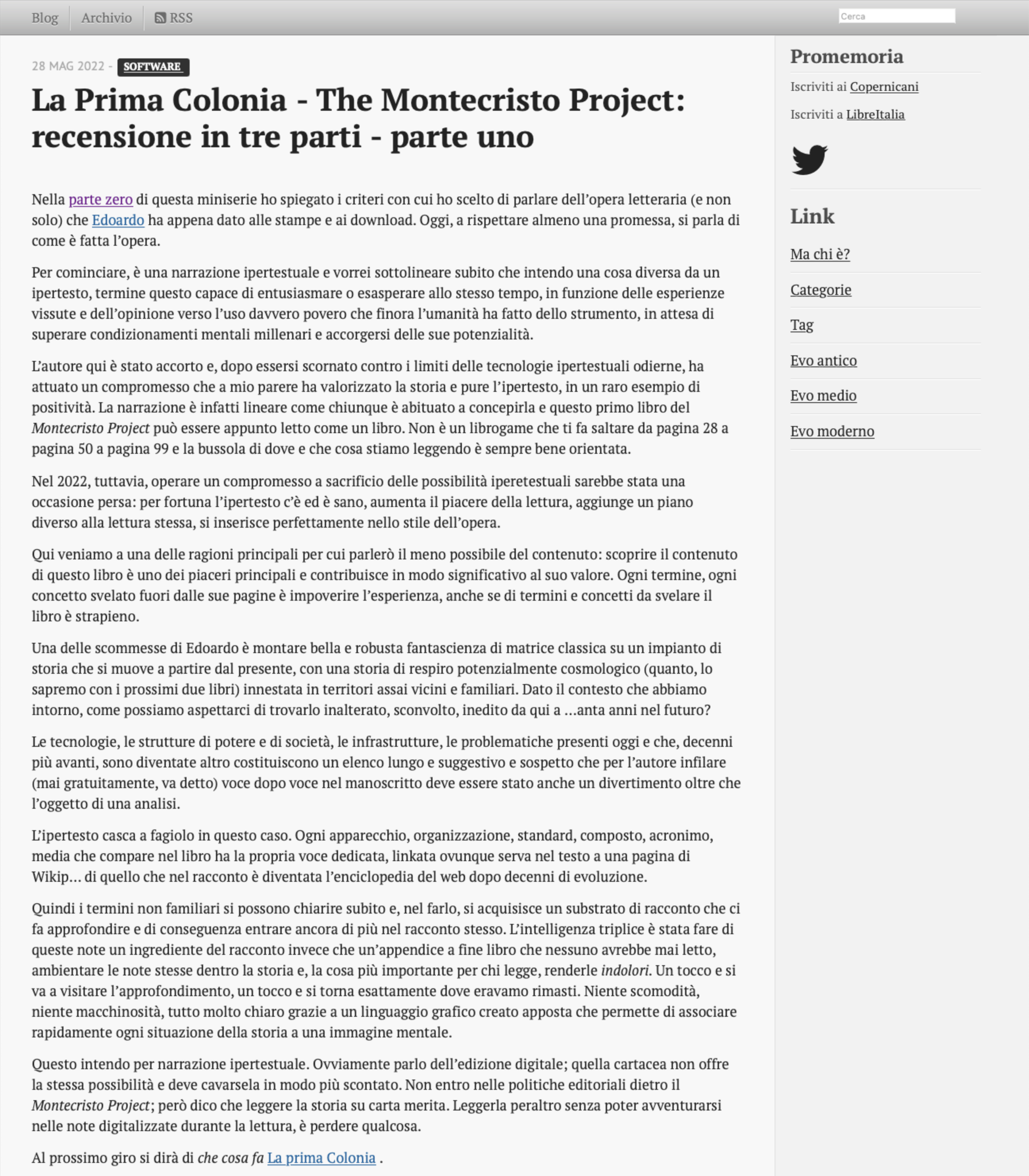 Questo intendo per narrazione ipertestuale. Ovviamente parlo dell’edizione digitale; quella cartacea non offre la stessa possibilità e deve cavarsela in modo più scontato. Non entro nelle politiche editoriali dietro il Montecristo Project; però dico che leggere la storia su carta merita. Leggerla peraltro senza poter avventurarsi nelle note digitalizzate durante la lettura, è perdere qualcosa.